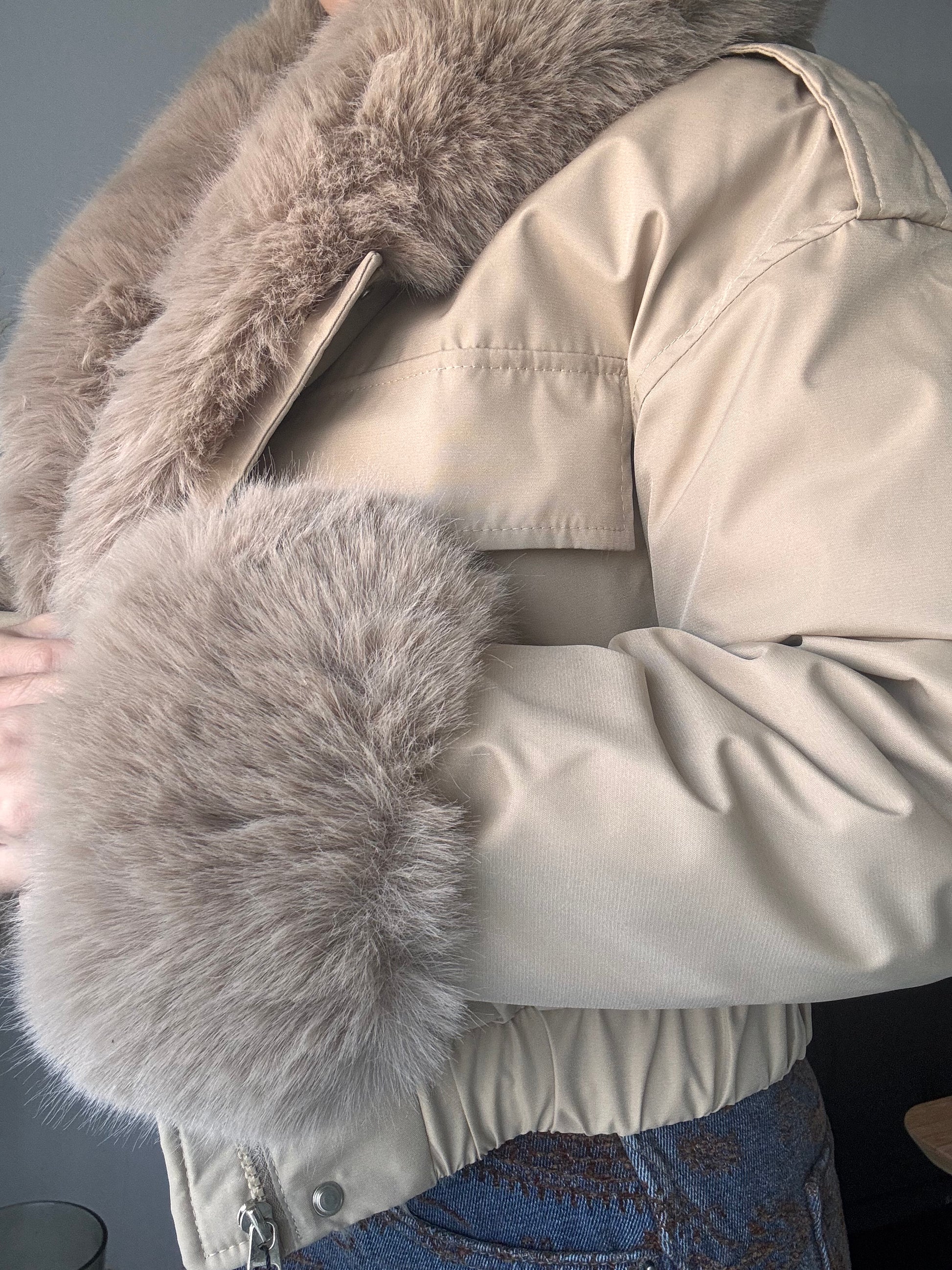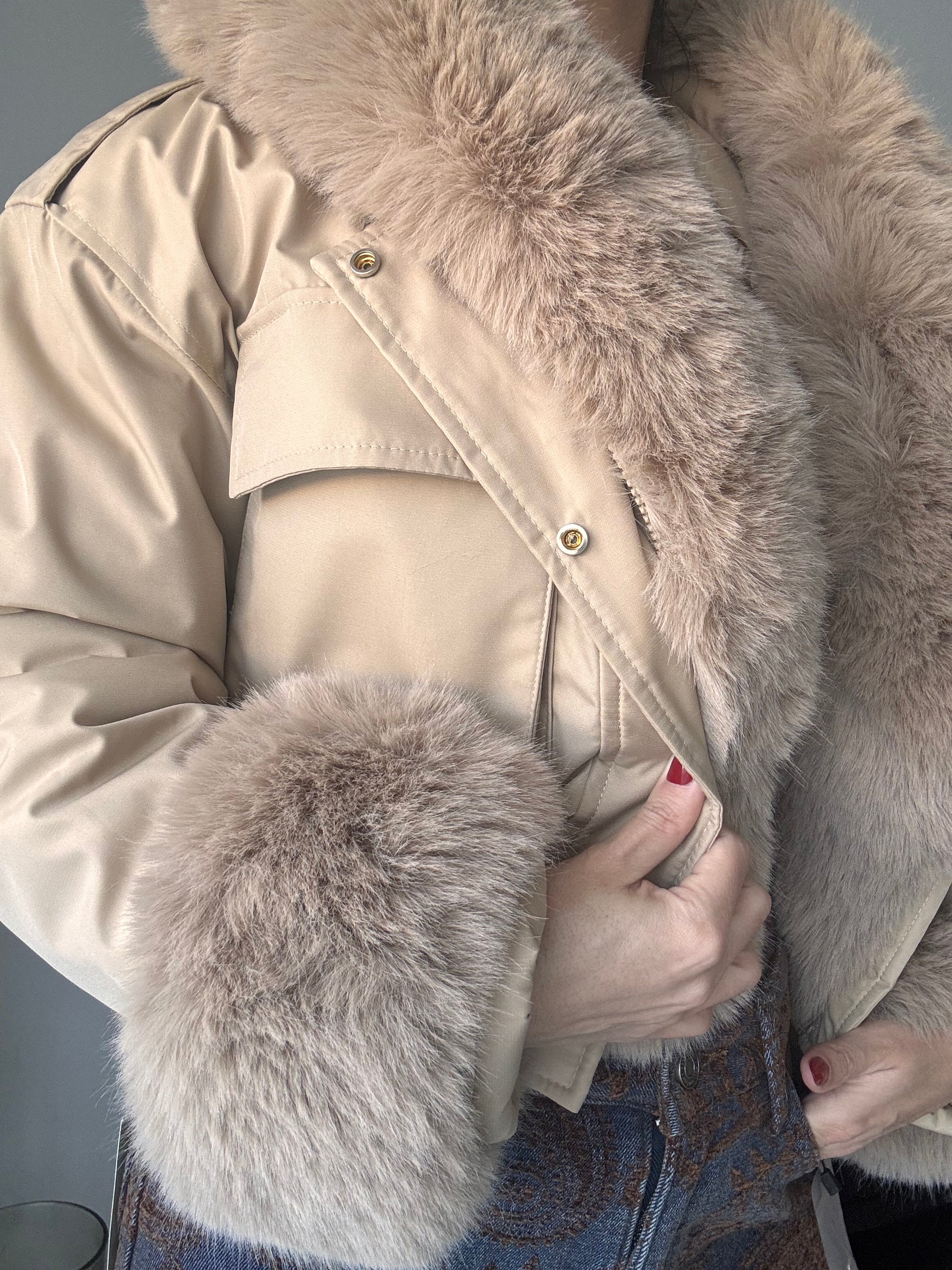 Abrigo corto forrado, con capucha. Pelo de la capucha y mangas se puede quitar.