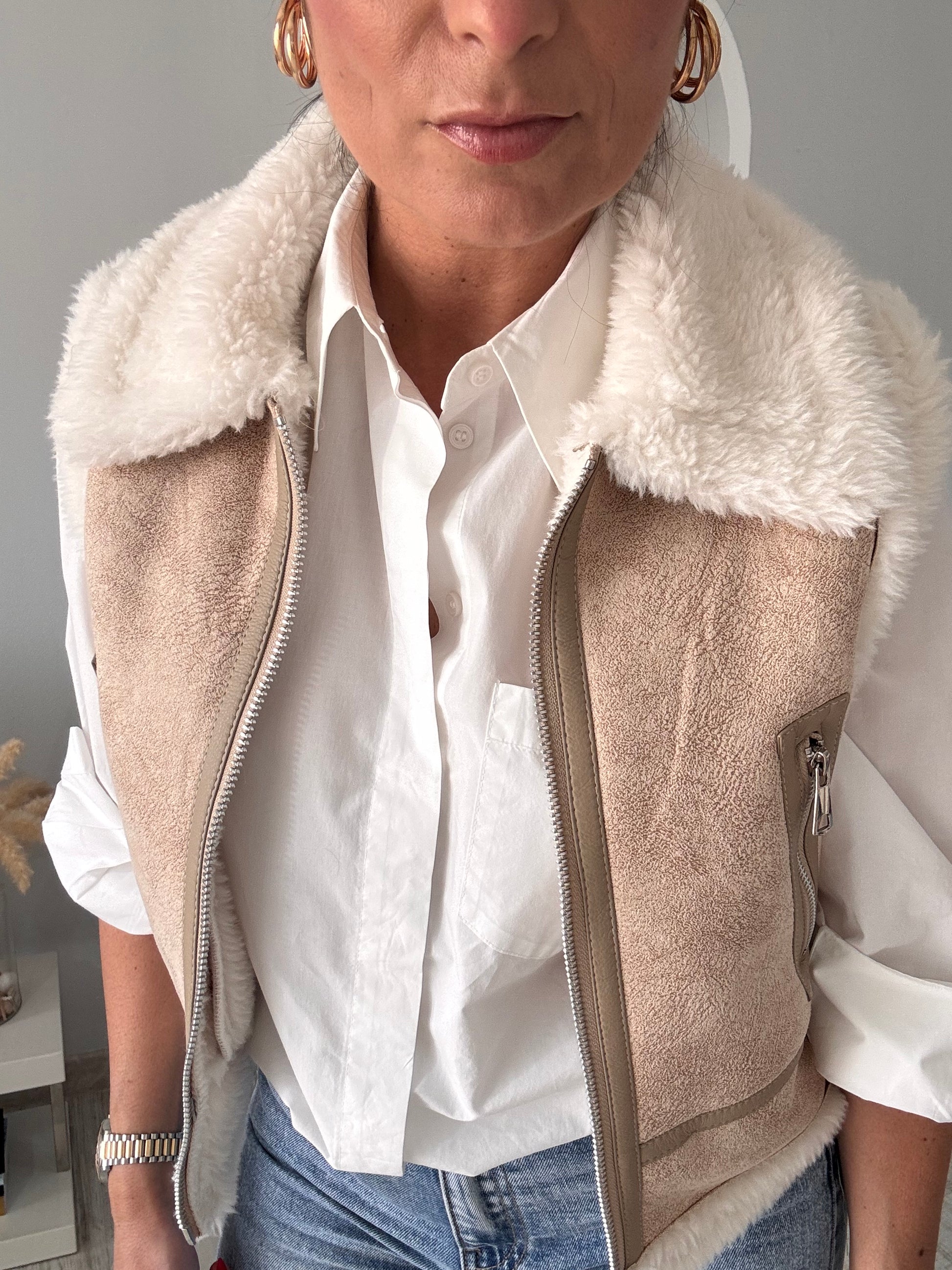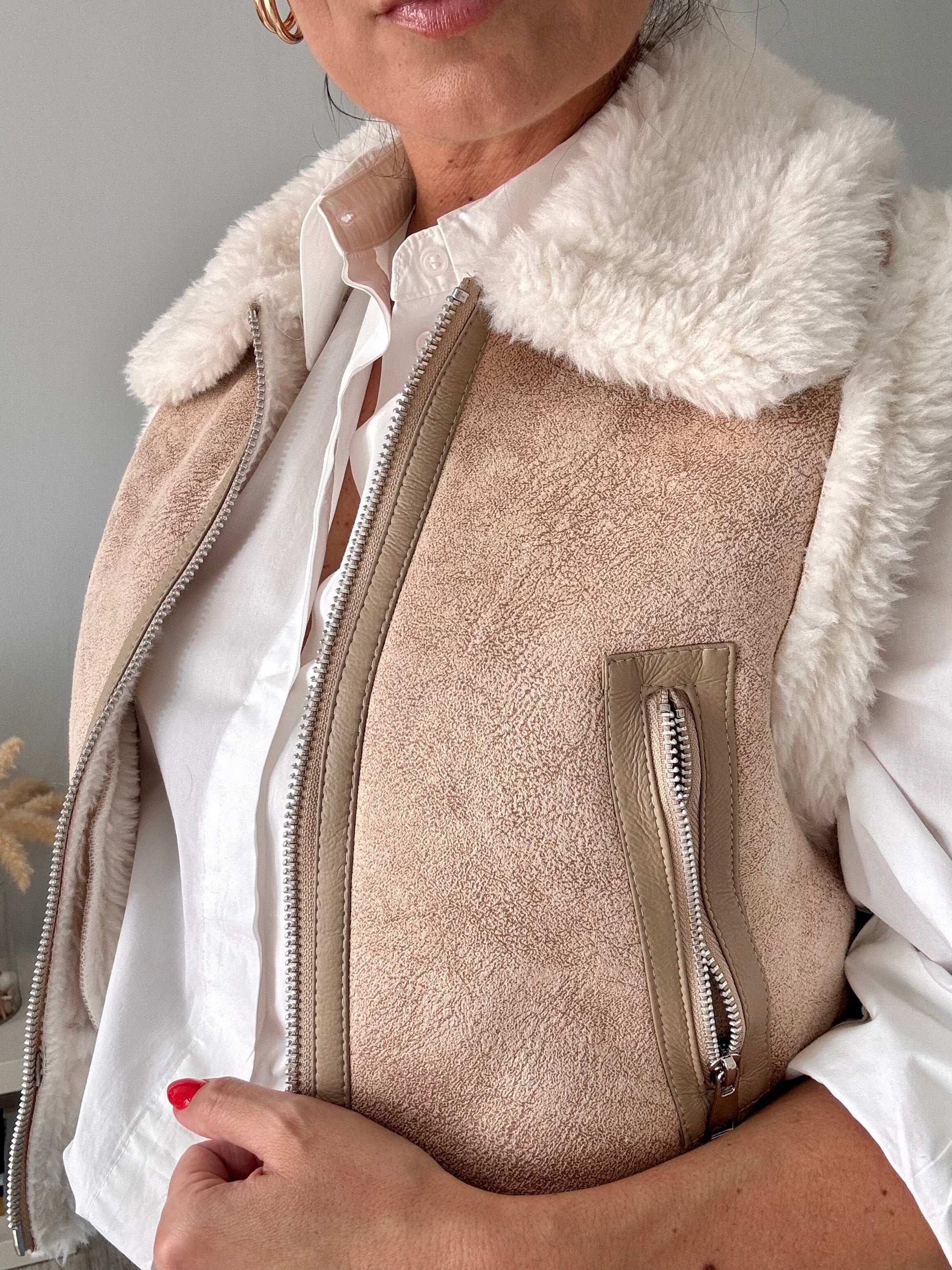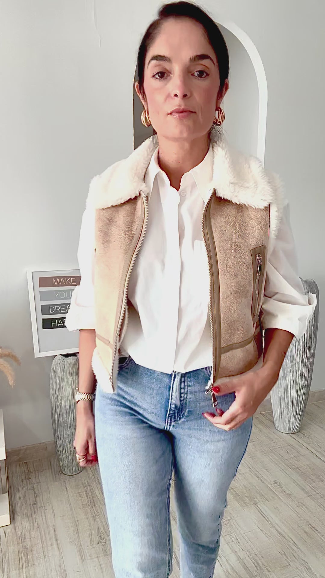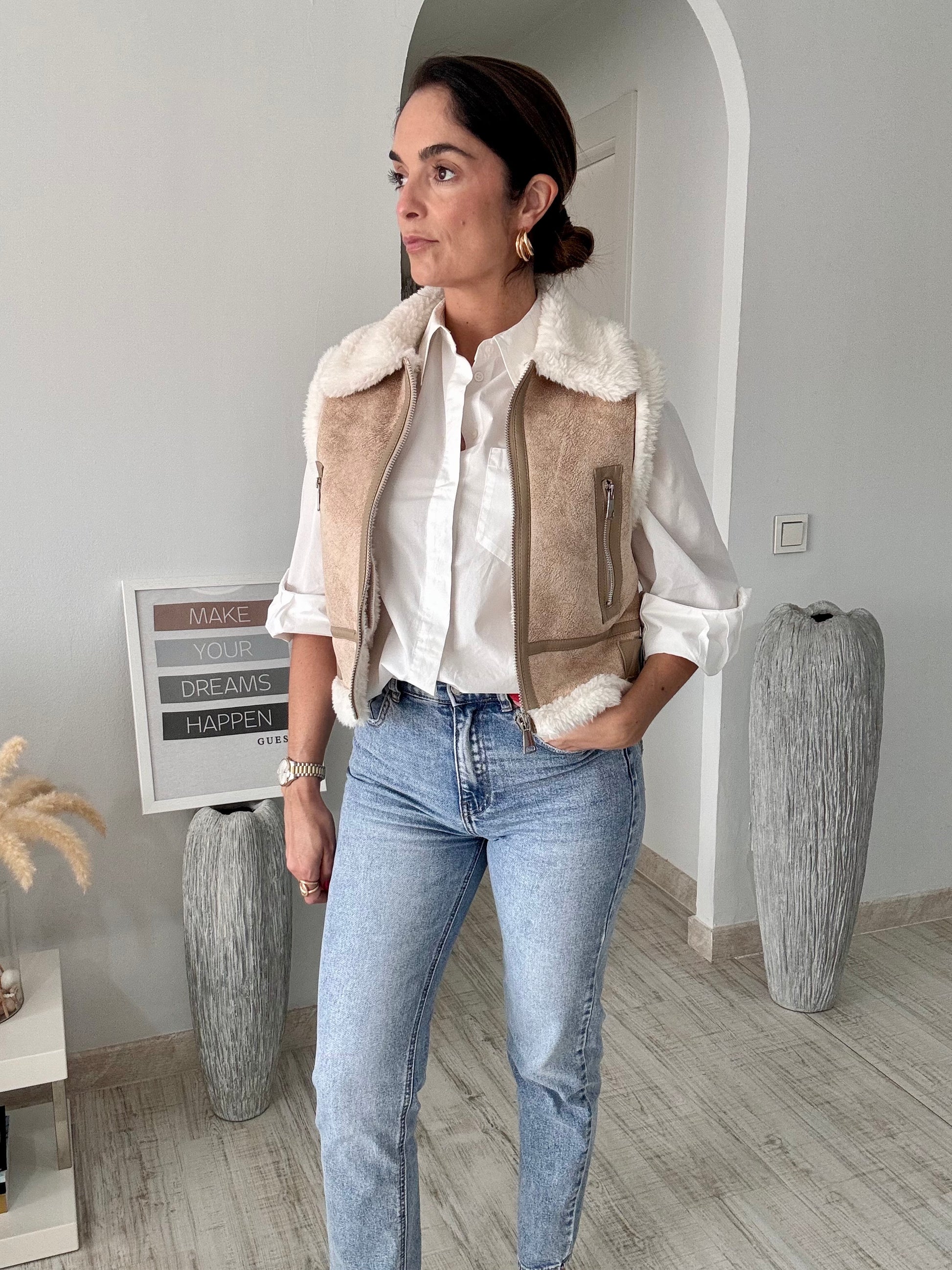 Chaleco con cierre de cremallera. Tiene pelo por dentro y hebillas en los laterales.