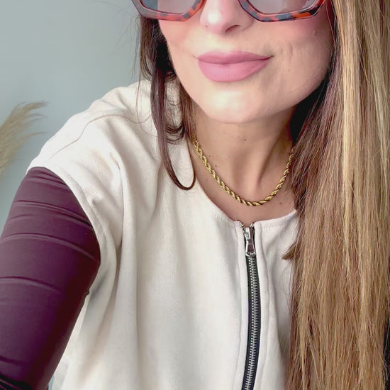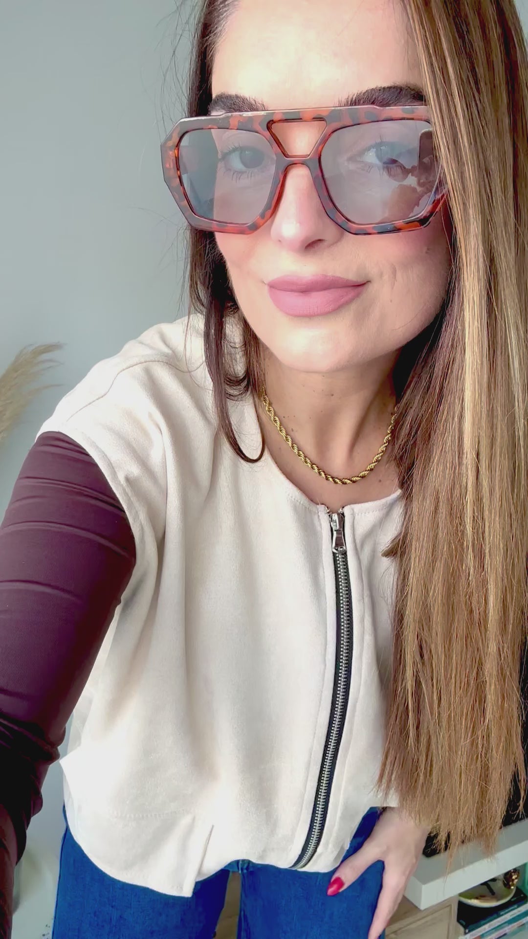 Chaleco Oversize en ante. Cierre con cremallera. Sin bolsillos.