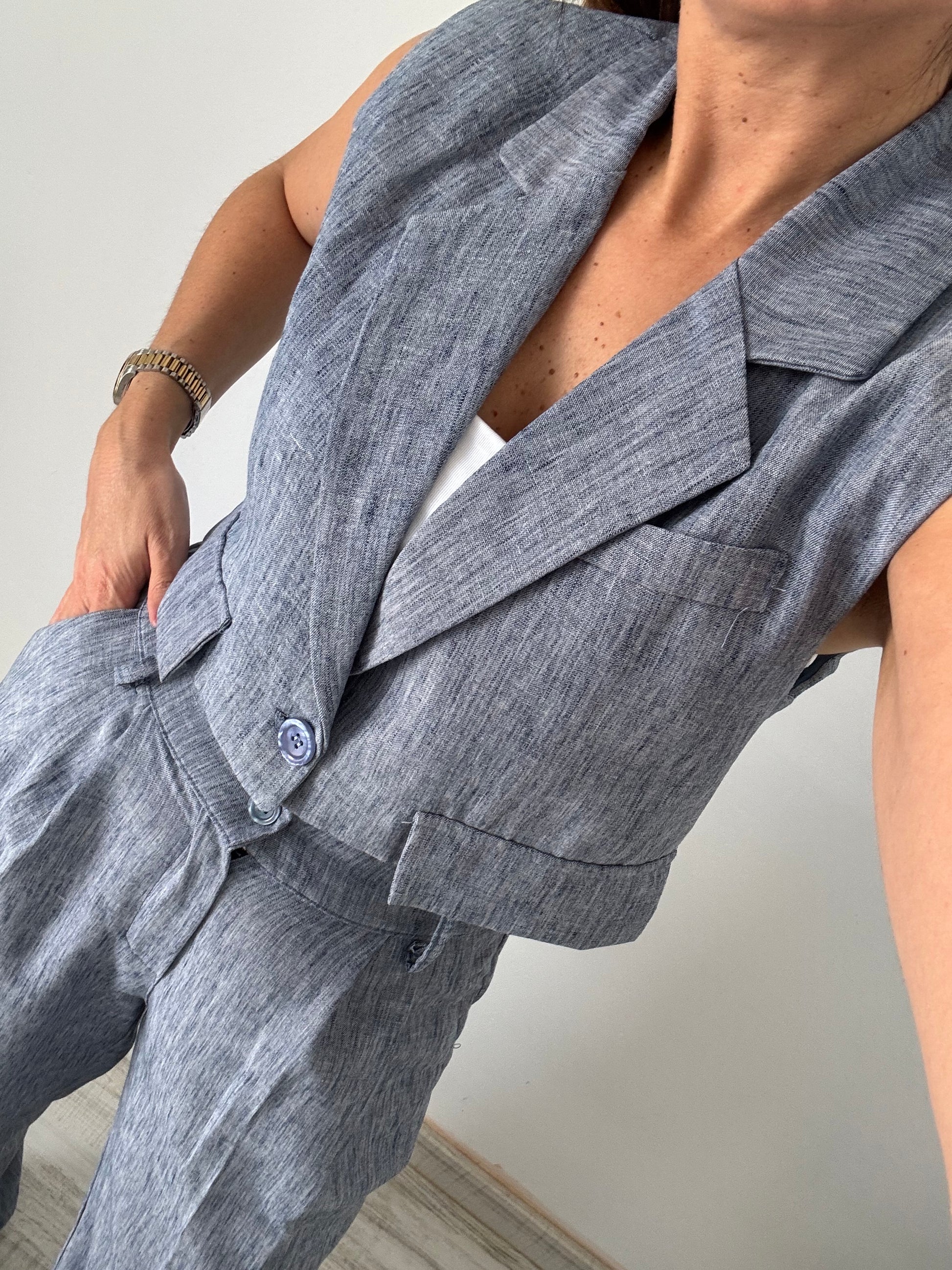 Chaleco tipo blazer y pantalon a juego.