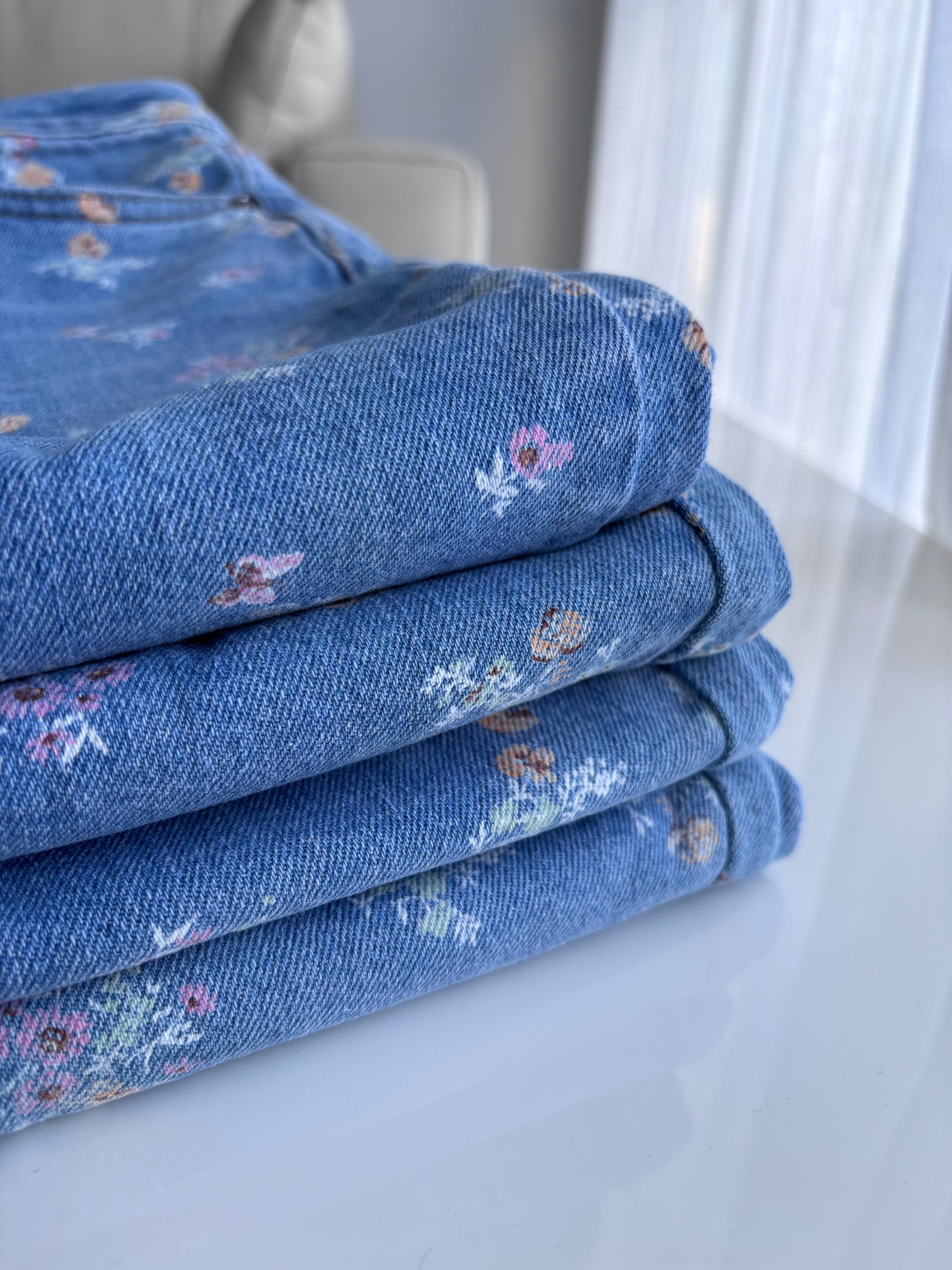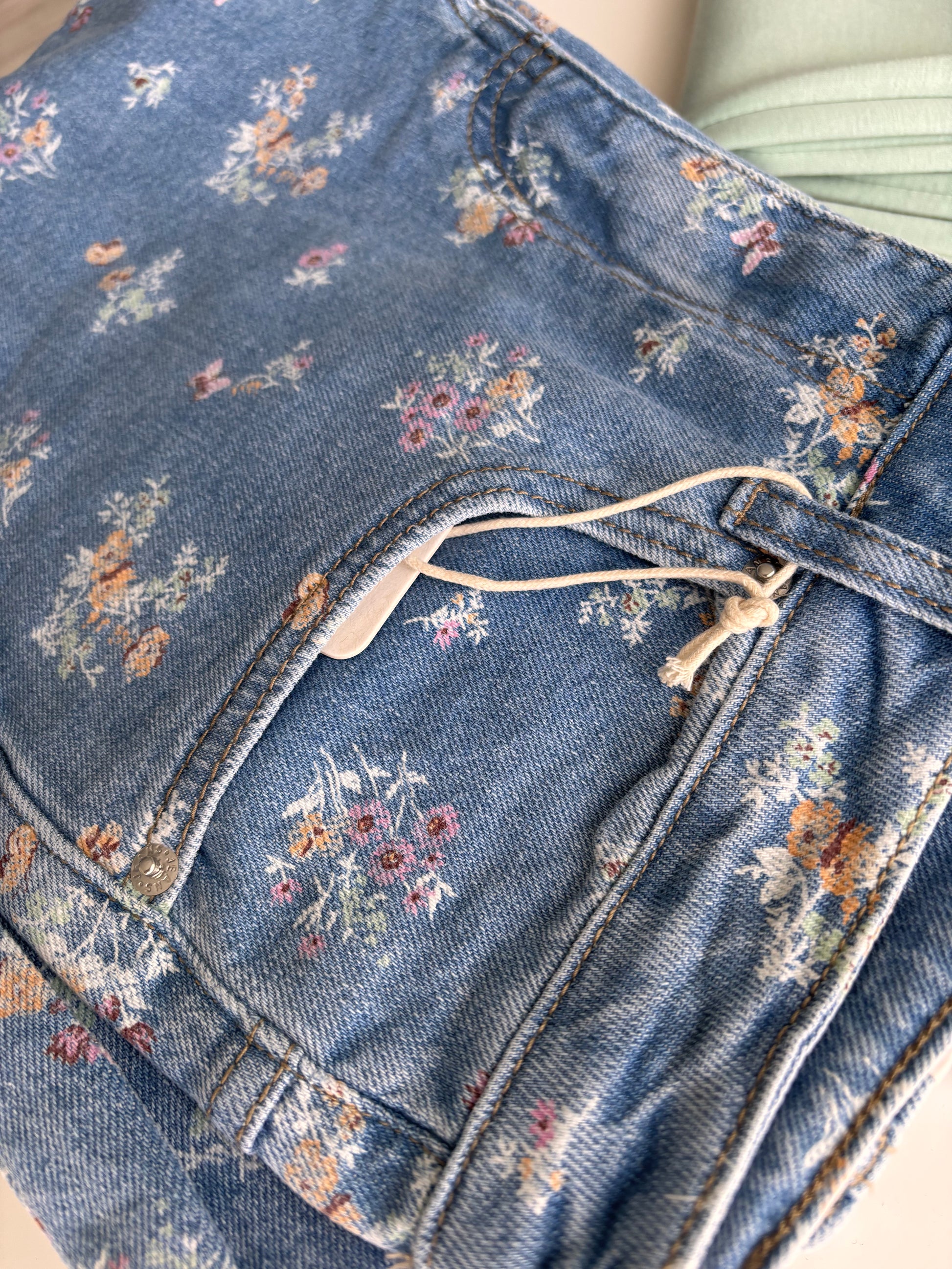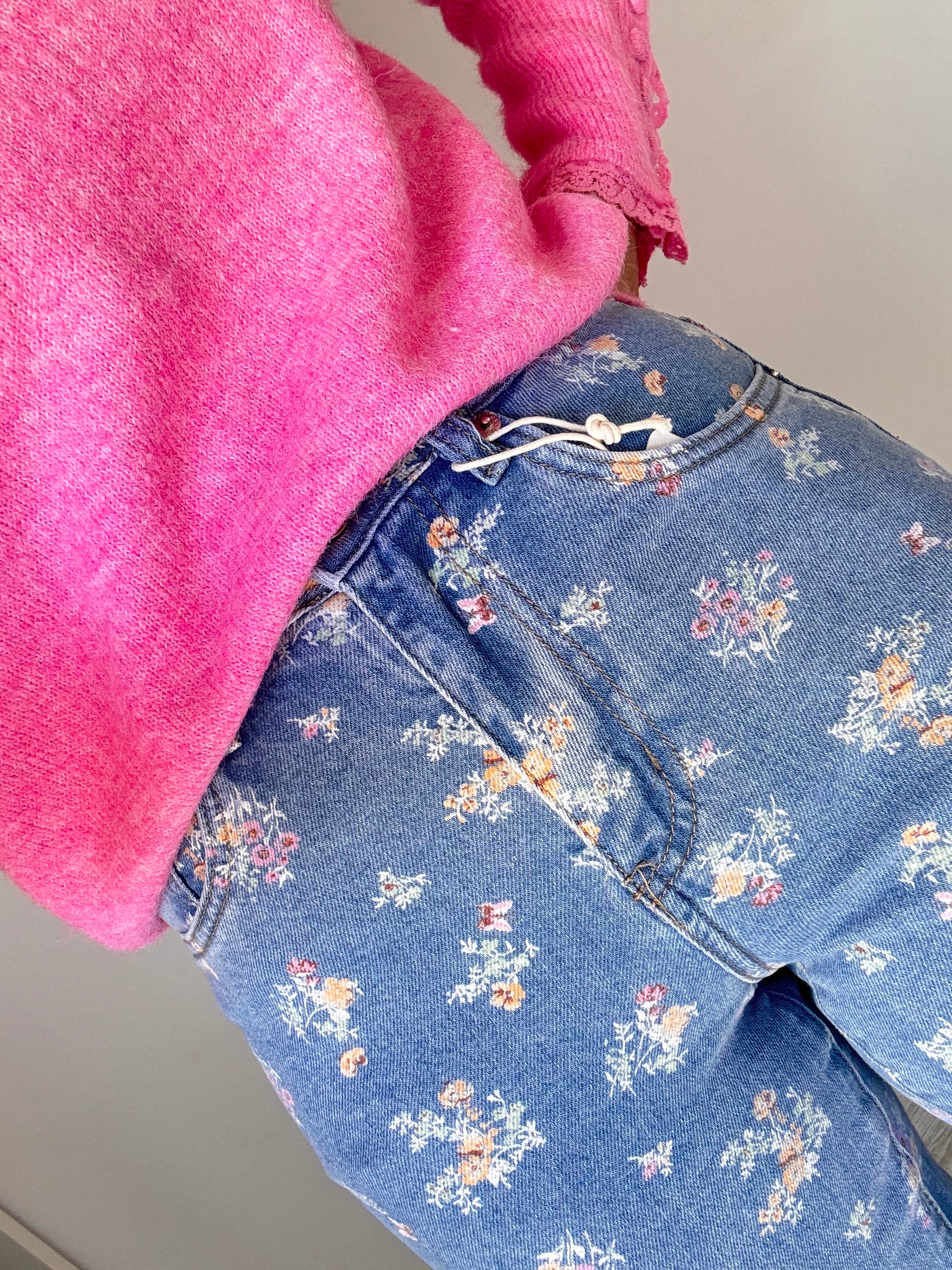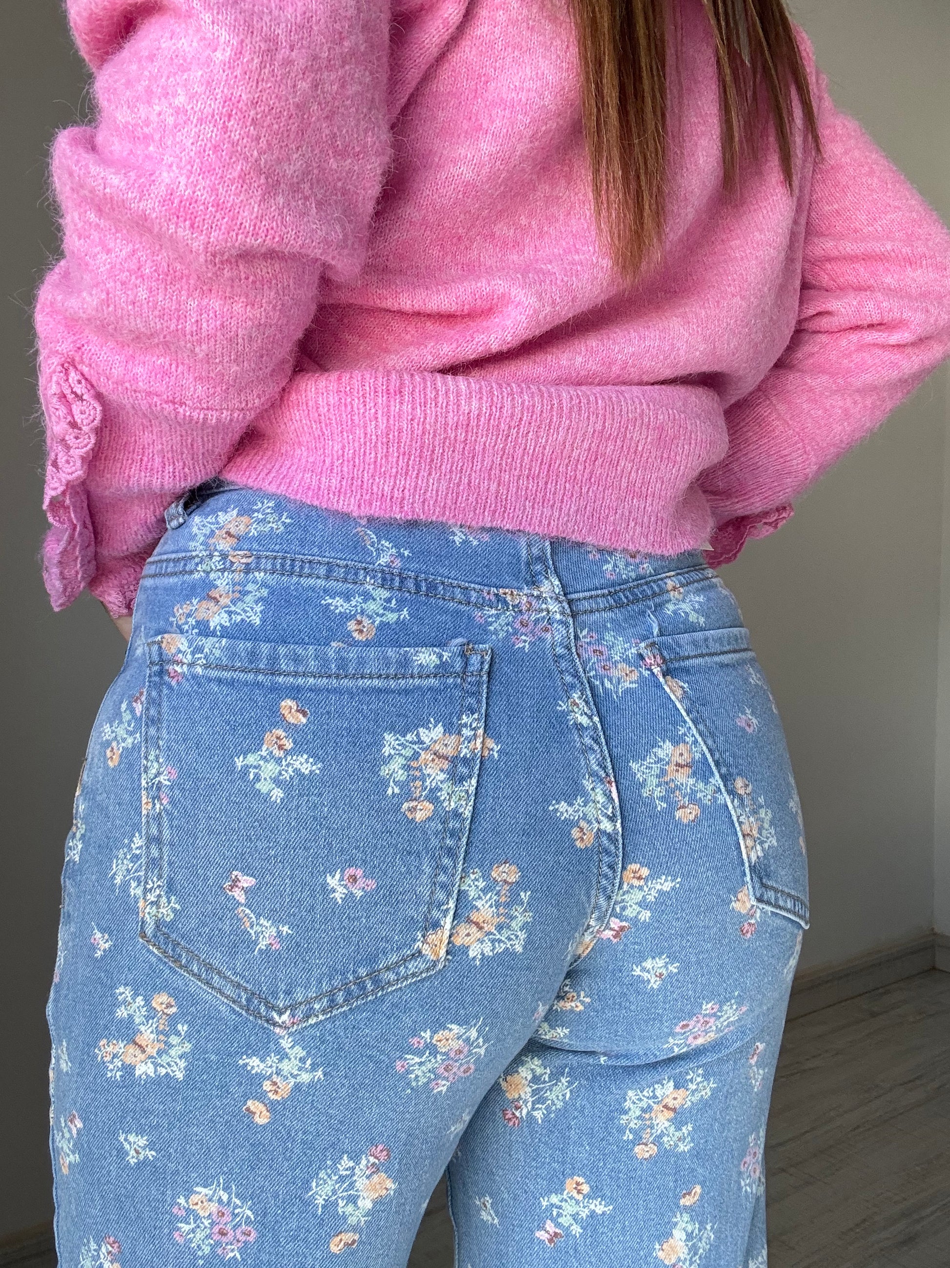 Vaquero 5 bolsillos con detalles de flores en tonos pastel. Tacto super suave y se adapta muy bien al cuerpo. Pierna en wide leg (ancho).